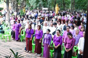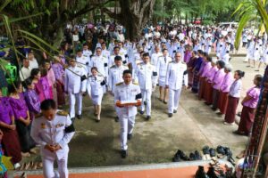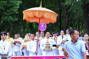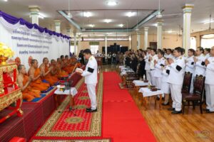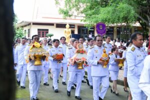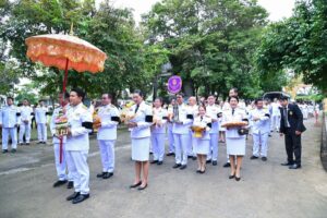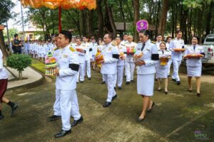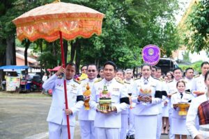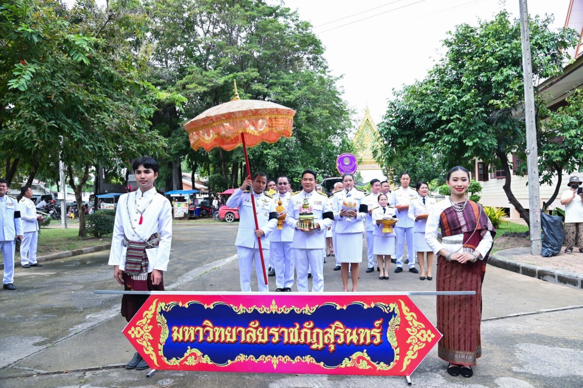 โดยมี องศาสตราจารย์ ดร.ฉลอง สุขทอง อธิการบดีมหาวิทยาลัยราชภัฏสุรินทร์ เป็นประธานประกอบพิธี พร้อมด้วยคณะผู้บริหาร คณะกรรมการส่งเสริมกิจการมหาวิทยาลัยราชภัฏสุรินทร์ หัวหน้าส่วนราชการ แขกผู้มีเกียรติ คณาจารย์ บุคลากร และนักศึกษา และประชาชน เข้าร่วมพิธีอย่างพร้อมเพรียงกัน  ณ วัดกัลยาณโกมุท บ้านแกน้อย ตำบลแกใหญ่ อำเภอเมืองสุรินทร์ จังหวัดสุรินทร์