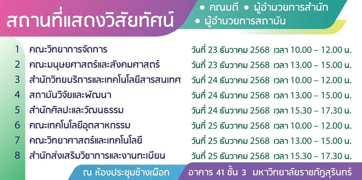 ขอเชิญคณาจารย์และบุคลากรมหาวิทยาลัยราชภัฏสุรินทร์ ร่วมรับฟังการแสดงวิสัยทัศน์ของผู้สมัครเพื่อเข้ารับการสรรหาผู้สมควรดำรงตำแหน่ง คณบดี ผู้อำนวยการสำนัก และผู้อำนวยการสถาบัน ระหว่างวันที่ 23 – 25 ธันวาคม 2568 ณ ห้องประชุมช้างเผือก ชั้น 3 คณะครุศาสตร์ (อาคาร 41) มหาวิทยาลัยราชภัฏสุรินทร์
