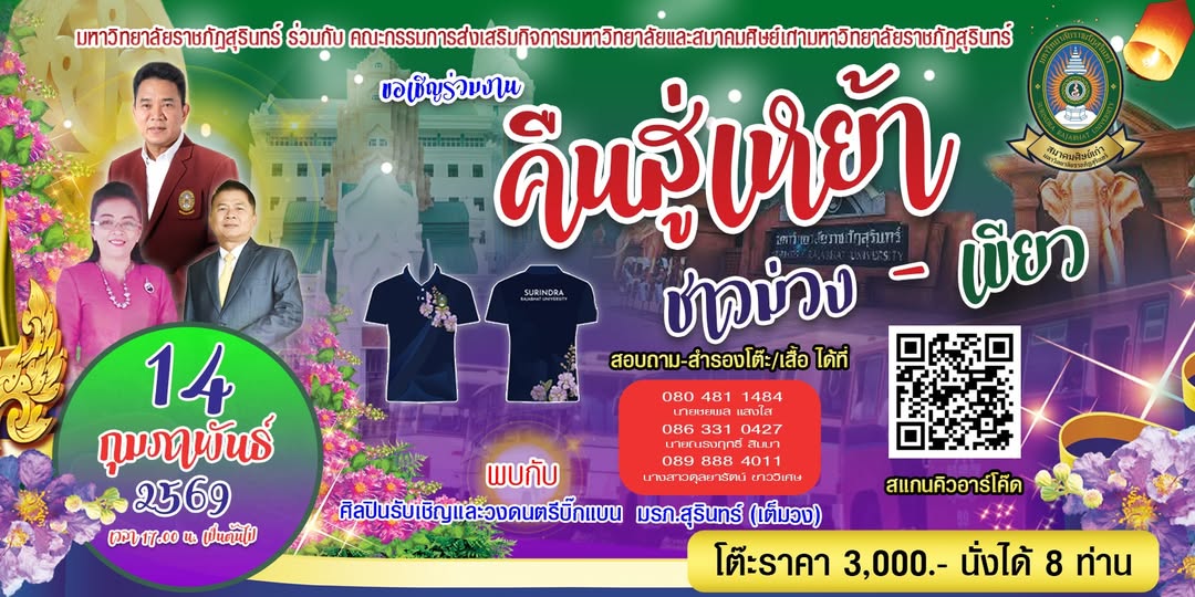 มหาวิทยาลัยราชภัฏสุรินทร์ ร่วมกับ คณะกรรมการส่งเสริมกิจการมหาวิทยาลัยราชภัฏสุรินทร์ และสมาคมศิษย์เก่ามหาวิทยาลัยราชภัฏสุรินทร์ ขอเชิญชวนศิษย์เก่ามหาวิทยาลัยราชภัฏสุรินทร์ทุกรุ่น ทุกท่าน ร่วมงาน “คืนสู่เหย้าชาวม่วง – เขียว” ในวันเสาร์ที่ 14 กุมภาพันธ์ 2569 ตั้งแต่เวลา 17.00 น. เป็นต้นไป ณ มหาวิทยาลัยราชภัฏสุรินทร์